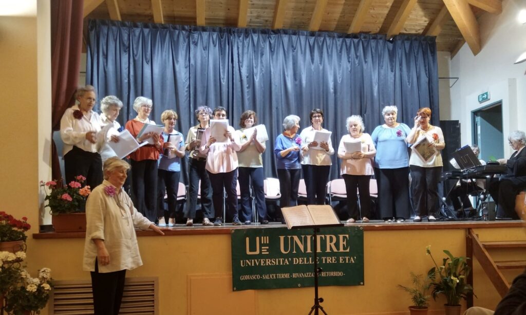 DOMENICA 11 MAGGIO primo appuntamento del festival dei cori a Rivanazzano Terme. Il pomeriggio si è aperto col saluto in musica delle “Voci del Rile”, il nostro coro tutto al femminile, diretto da Elena Mutti, col prezioso contributo di Riccarda Carrer alle tastiere e di Claudia Buzzi alla fisarmonica. A seguire, in ordine rigorosamente alfabetico, i cori di Alessandria , Broni e Pinerolo (TO) che hanno portato un repertorio vario e coinvolgente, che andava dal sacro al profano, dai medley anni ’50 ai canti popolari e tradizionali delle varie regioni italiane. Erano presenti i Presidenti della UNI3 di Alessandria e Broni, rispettivamente Vittorio Villa e Graziella Moroni, nonchè la vice presidente di Pinerolo, Francesca Pignatelli in rappresentanza di Liliana Rasetti: tutti loro hanno sottolineato l’importanza ed il valore di una manifestazione che permette l’incontro e lo scambio di esperienze tra i componenti di più associazioni ed, al contempo, esalta e valorizza l’impegno profuso nel corso dell’anno dai componenti delle corali per preparare i canti ed il concerto. Nel suo intervento la nostra Presidente Anna Corbi ha sottolineato, infatti, che “il canto coreutico ha un valore eccezionale perchè riunisce un gruppo di persone per realizzare, insieme, un suono armonico e un’esperienza unica che è in definitiva il risultato di lunghi mesi di impegno e prove. Grazie al canto corale aumenta la crescita personale dei coreuti, la socializzazione e si sviluppa al contempo la musicalità ed il benessere emotivo”. Un ringraziamento particolare va ai nostri sponsor che hanno permesso l’allestimento dei cesti -dono, allo staff organizzativo e, ultimo ma non ultimo, ai tre comuni patrocinanti ed in special modo al vice sindaco di Rivanazzano